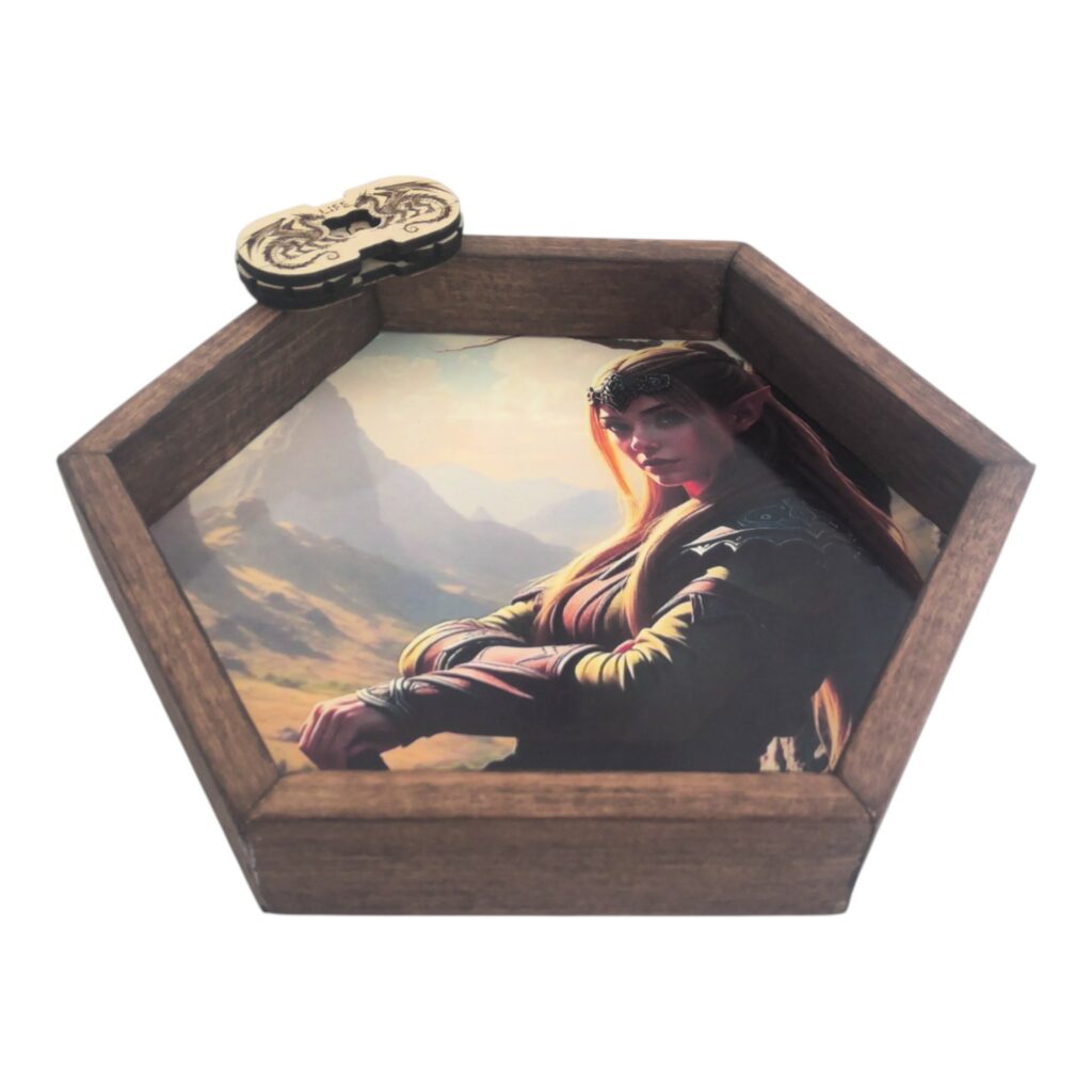 🧝♀️ Piste de dés – Elfe Guerrière 🌄🏹 Plongez vos dés dans un univers de fantasy ! Cette piste hexagonale en bois, avec son impression d’elfe guerrière, transforme chaque jet en un moment épique.