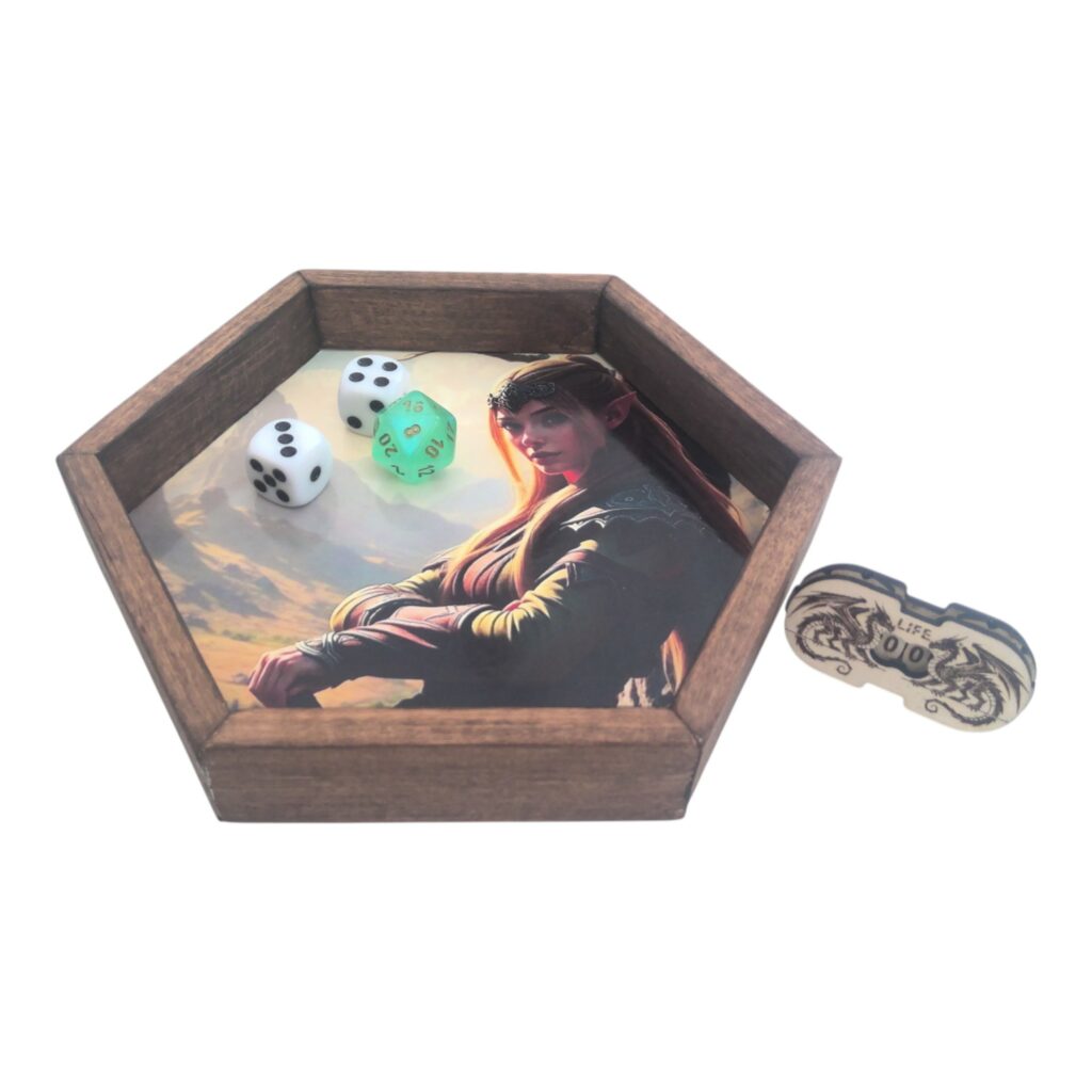 🧝♀️ Piste de dés – Elfe Guerrière 🌄🏹 Plongez vos dés dans un univers de fantasy ! Cette piste hexagonale en bois, avec son impression d’elfe guerrière, transforme chaque jet en un moment épique.