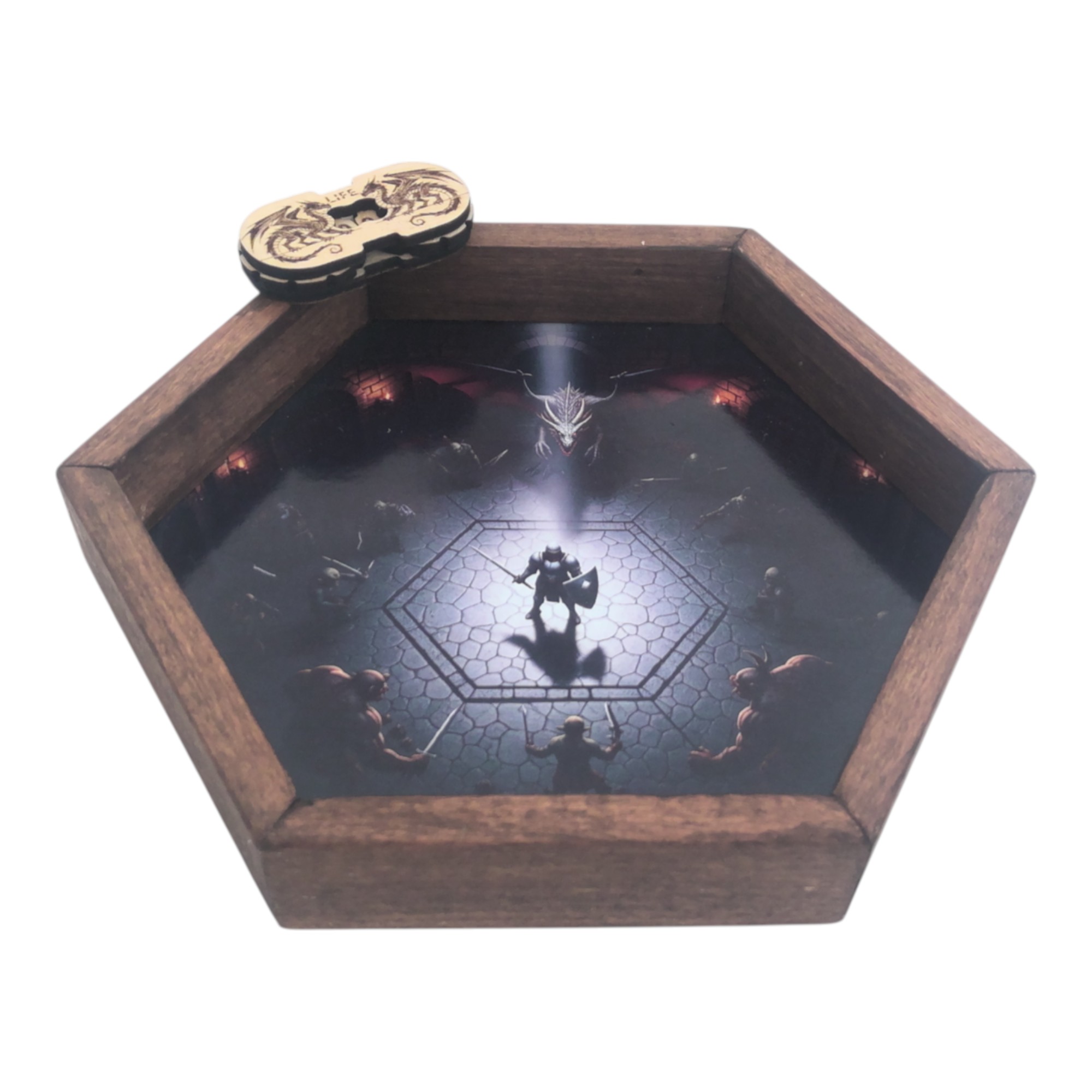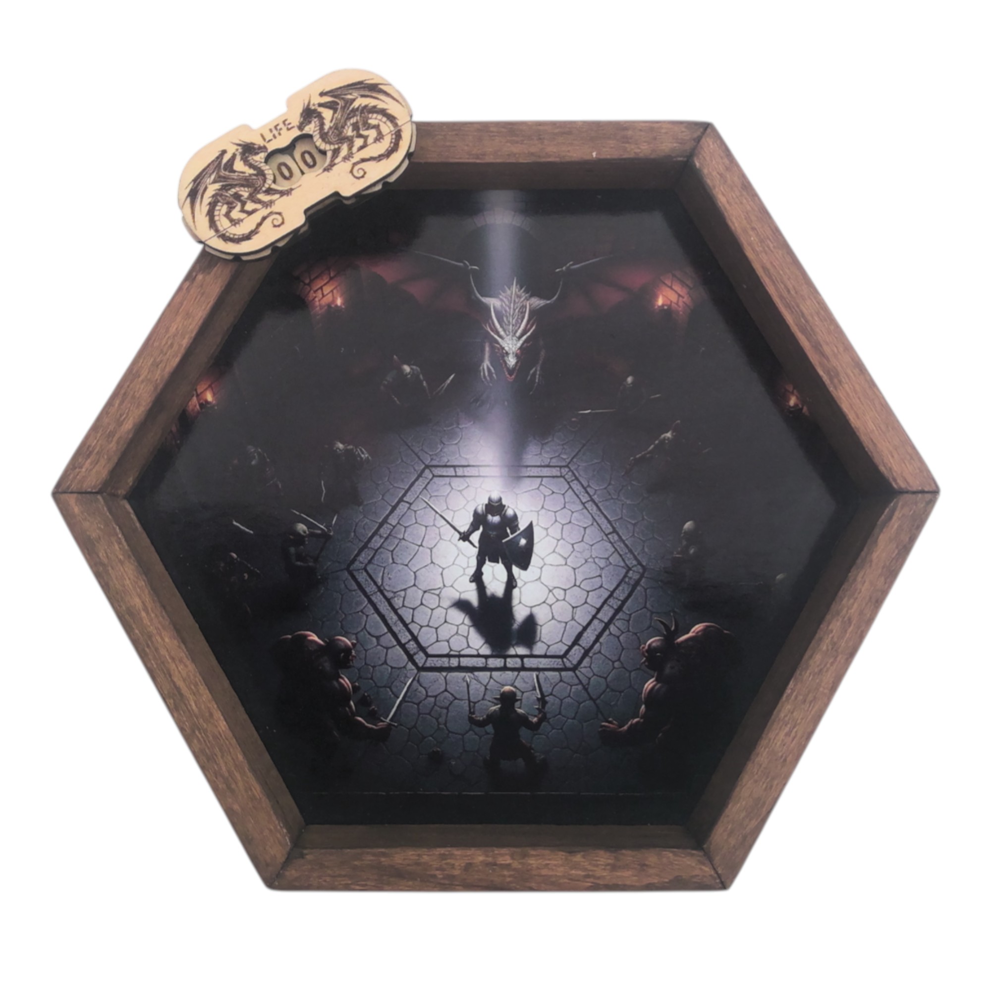 🐉 Piste de dés – Seul contre tous 🏰🔥 Revivez le frisson du combat final ! Cette piste hexagonale en bois, avec son impression d’arène seul face contre tous, transforme chaque lancer en un affrontement mémorable.