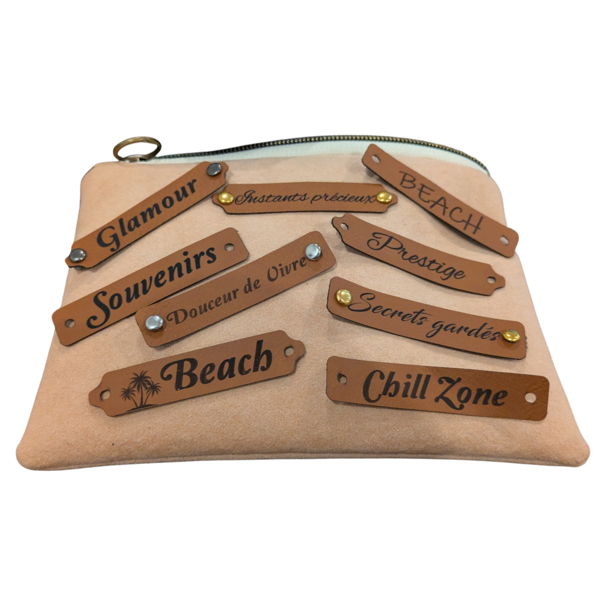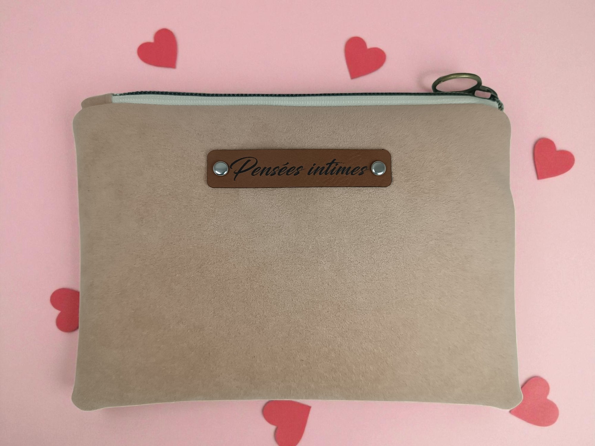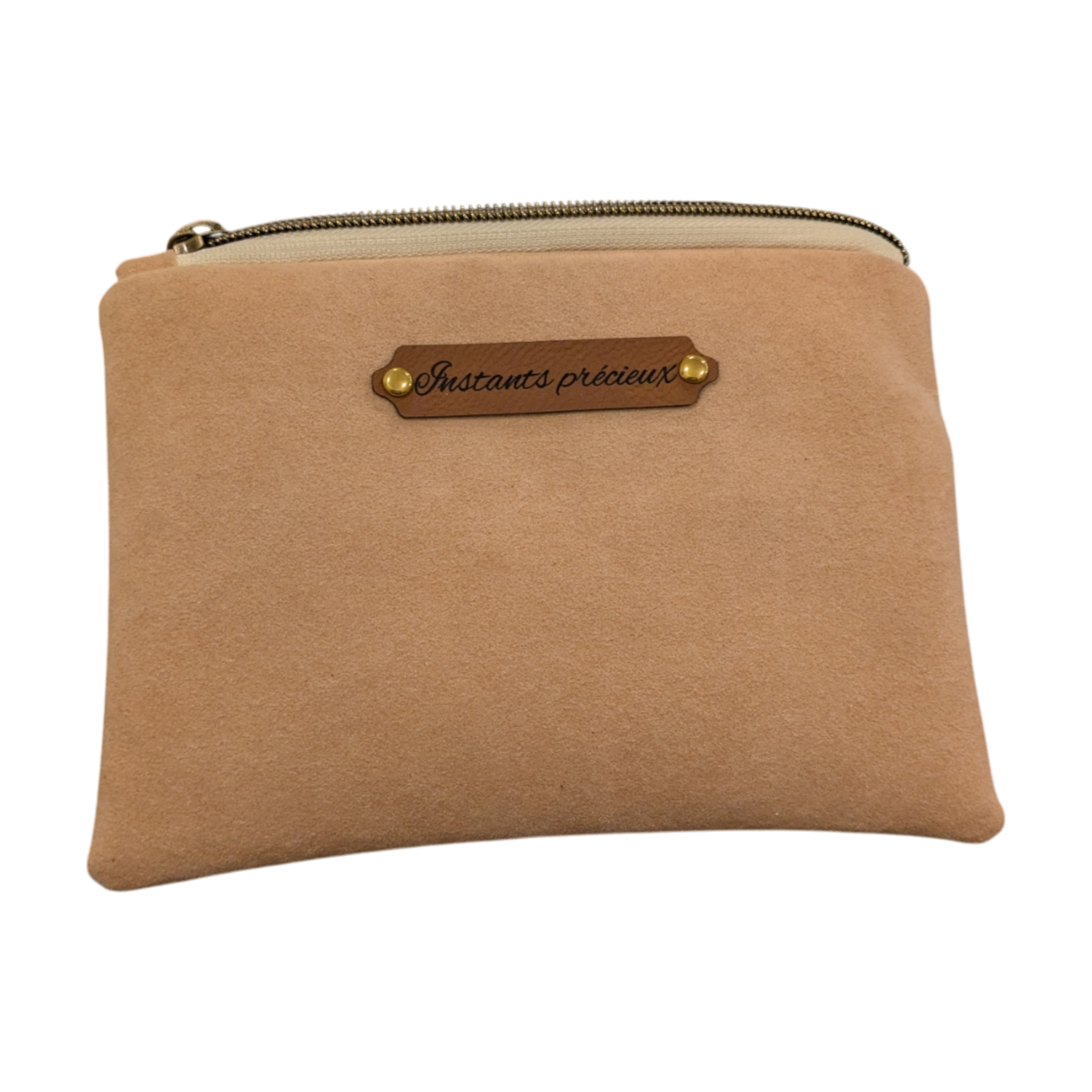 Pochette artisanale en suédine, doublure gaze de coton Rose ou verte. Étiquette cuir PU gravée et rivetée (prénom, date, lieu, message court). Zip métal laiton vieilli. Dimensions 18×13 cm. Idées de gravure : La Plage, Instant précieux, Souvenirs, Merci maîtresse, Carpe diem, Mon trésor, Week-end, Bestie, Avec amour…