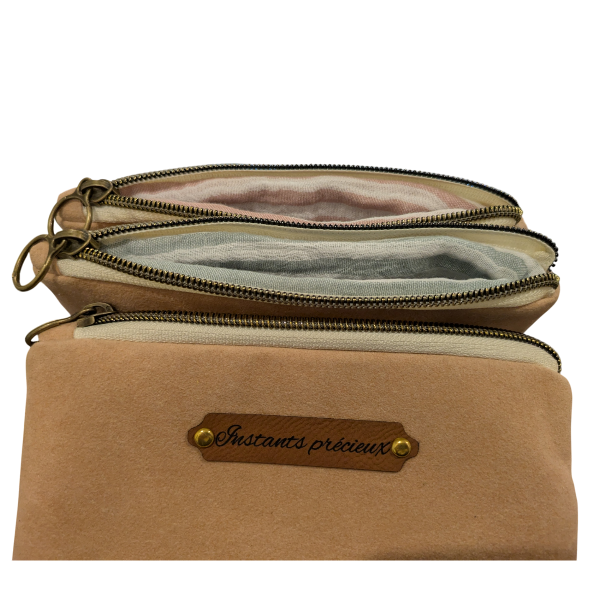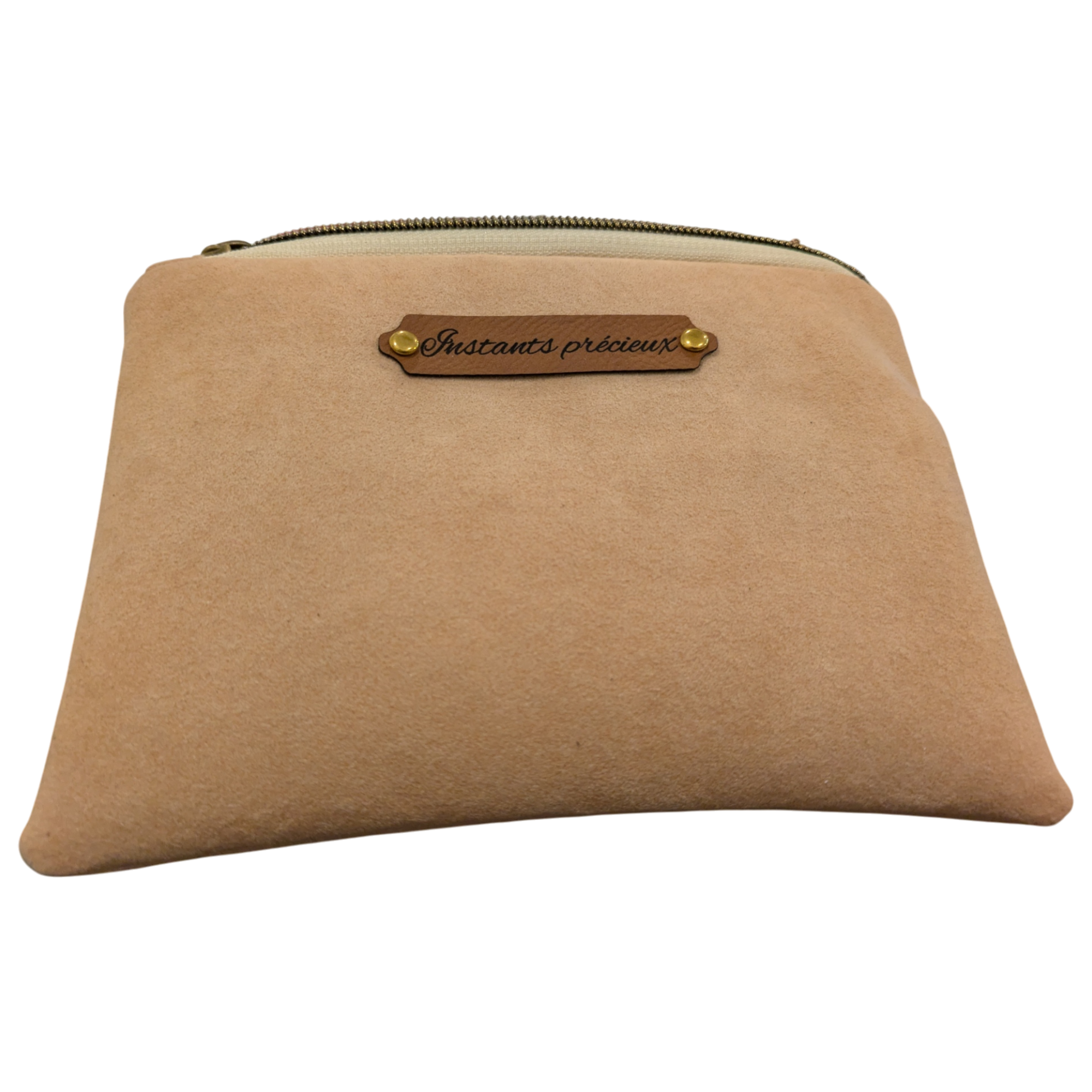 Suédine douce • Doublure gaze Vert ou Rose • Étiquette cuir PU gravée • 18×13 cm • Zip métal.
