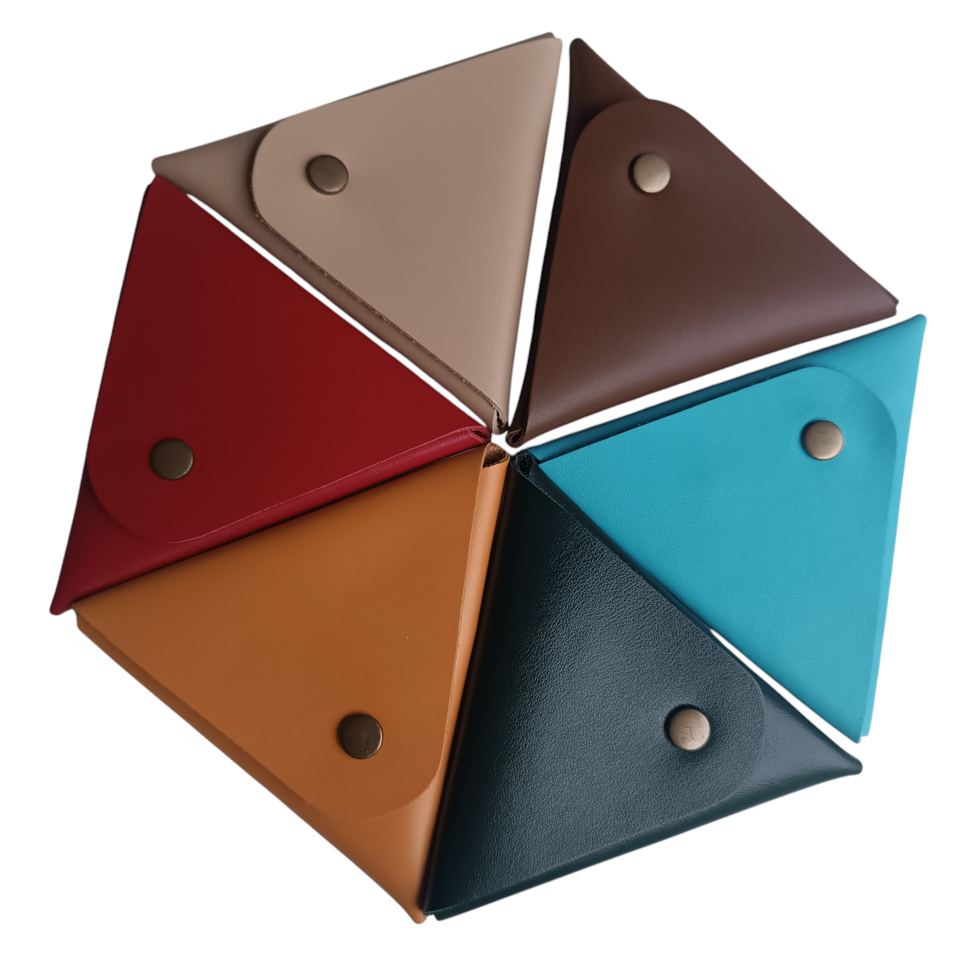 Porte‑monnaie triangle en cuir véritable, fabriqué et monté par nos soins. Compact et élégant, il se glisse facilement dans la poche d’un jean ou d’une veste. La fermeture est assurée par deux boutons pression Ø12 mm de qualité professionnelle, fini métal vieilli.