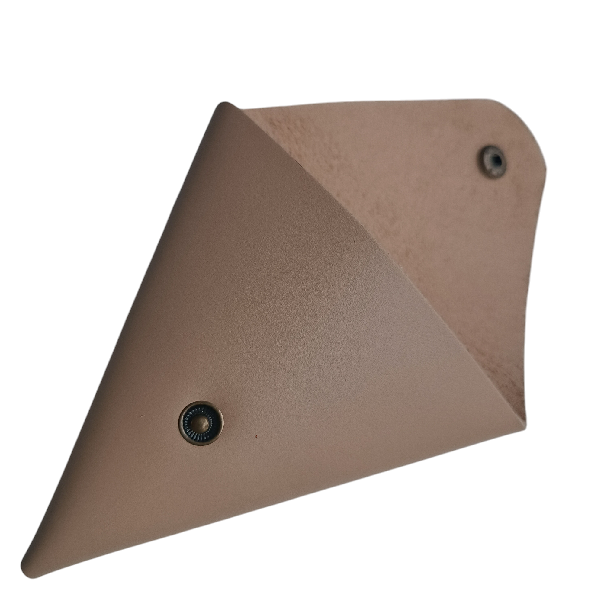 Porte‑monnaie triangle en cuir véritable, monté à la main • 2 boutons pression Ø12 mm en métal vieilli • Format compact (triangle 11 cm de côté) • Cuir veau/vachette, grain lisse, mi‑souple (1–1,5 mm).